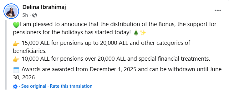 „Од денеска почна исплатата на новогдишниот бонус во износ од 100 односно 150 евра. Овој бонус е заслужена поддршка за над 760 илјади корисници. Од нив 541 илјада пензионери, кои примаат до 200 евра месечно, ќе имаат корист од бонус од по 150 евра, додека 221 илјада пензионери кои примаат над 200 евра ќе добијат бонус од 100 евра“, напиша Ибрахимај.