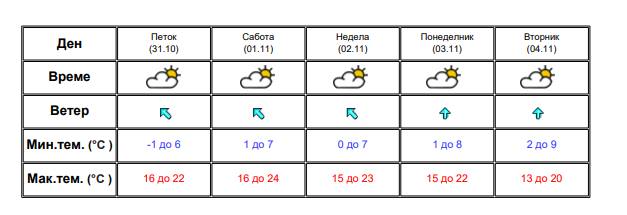 Денеска не’ очекува постудено утро со можност за појава на утринска магла во пониските котлини. Преку денот времето ќе биде сончево со мала до умерена локална облачност и слаб јужен ветер.