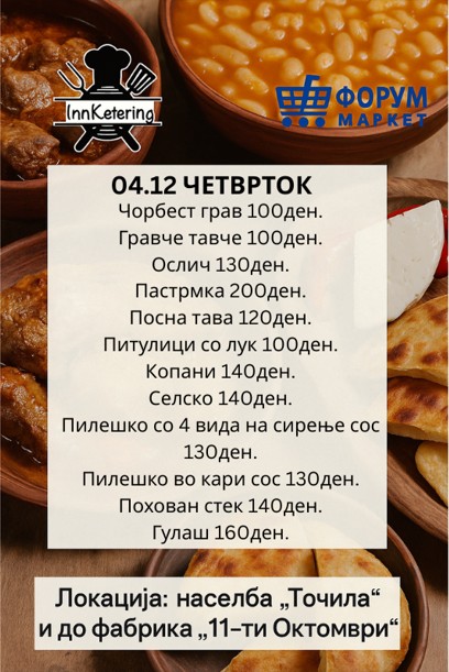 Не знаете што за ручек денеска? INN Кетеринг заедно со Форум маркети во Прилеп ви носат богато дневно мени за четврток, 04.12.2025 – со избор за сечиј вкус и џеб.