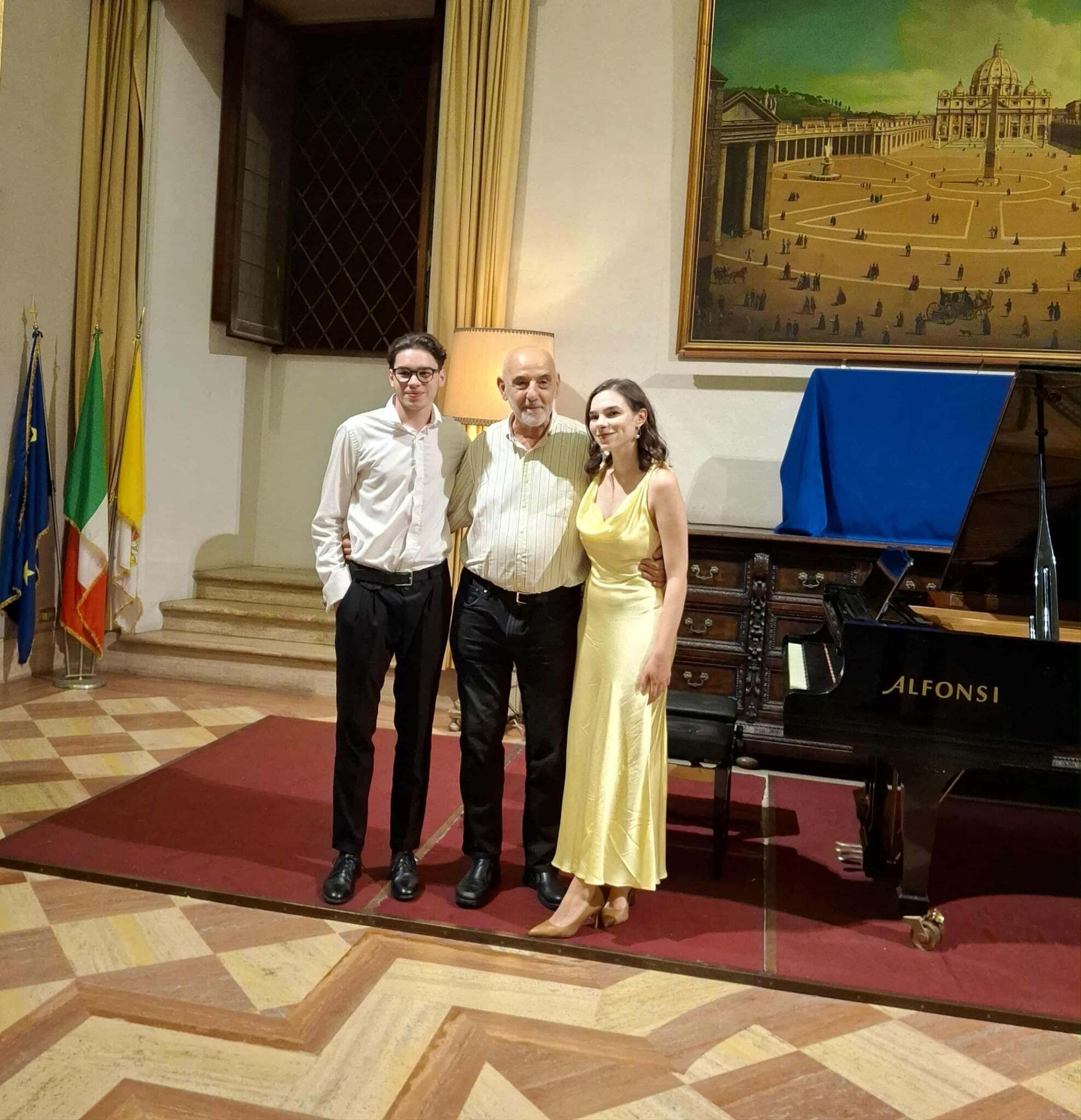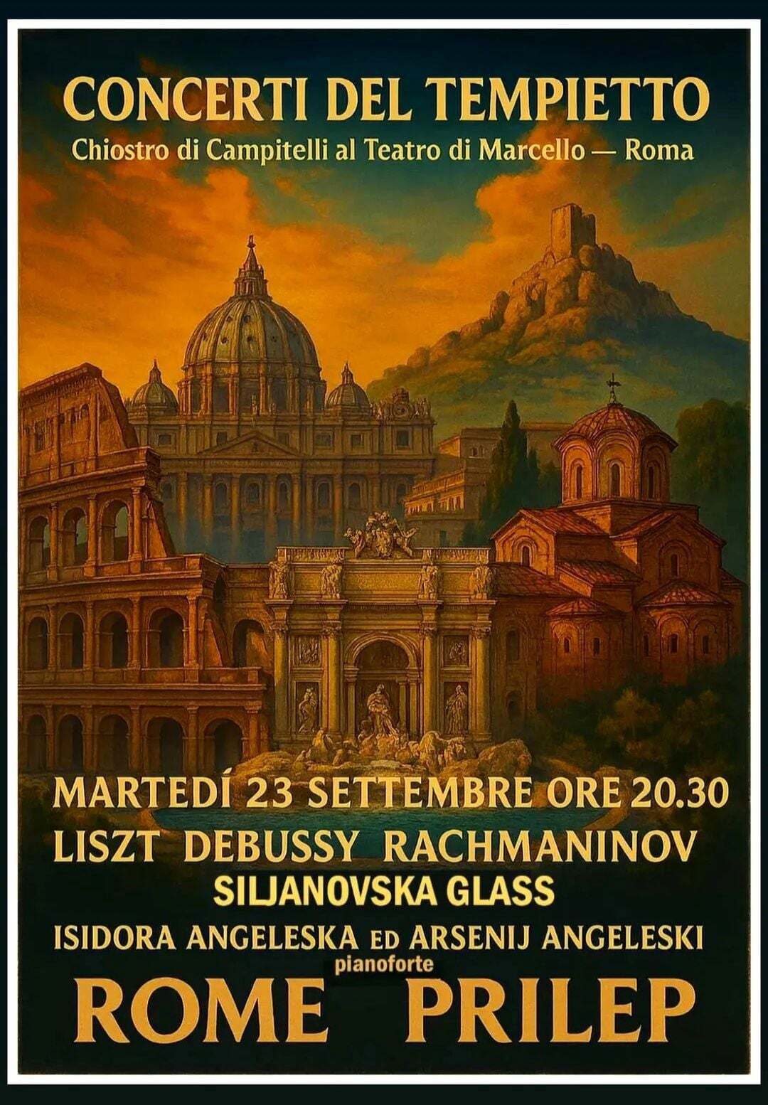 Првиот концерт се одржа во Рим на 23 септември во салата „Балдини“, во непосредна близина на античкиот театар „Марчело“. Концертот беше во склоп на фестивалот „Concerti del Tempietto“, кој оваа година се одржа од 26 јули до 28 септември. Исидора настапи со три пиеси од циклусот „Години на патување – Швајцарија“ од композиторот Франц Лист. Арсениј, пак, настапи со внимателно селектирани прелудиуми од втората книга на композиторот Клод Дебиси, како и од опус 23 на рускиот композитор Рахмањинов. Исидора, исто така, изведе етида од современиот композитор Филип Глас и минијатура „Cozy“ од младата македонска композиторка Сара Сиљановска, студентка на катедрата по композиција на ФМУ – Скопје.