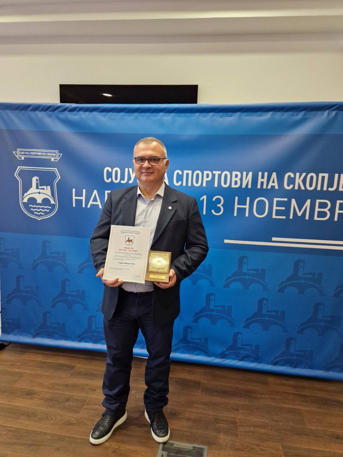 Џудо федерацијата на Македонија со особена чест и гордост информира дека Сојузот на спортови на Скопје денес, по повод празникот 13 Ноември – Денот на ослободувањето на Град Скопје, ја додели 13 Ноемвриската награда за Спортски работник на годината на м-р Горан Мицкоски, стручен соработник во Џудо федерацијата на Македонија и член на организацискиот тим на федерацијата.