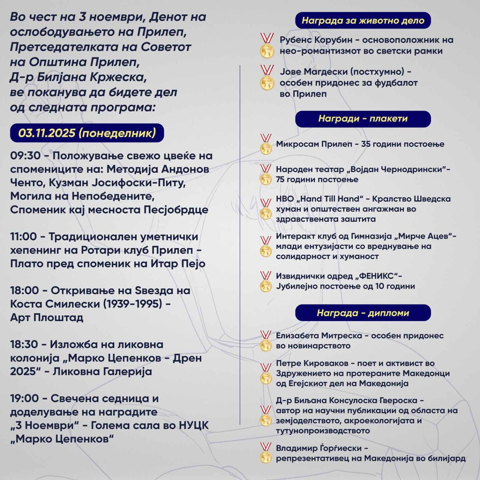 Одбележувањето ќе заврши со свечената седница во НУЦК „Марко Цепенков“, на која ќе бидат доделени признанијата „3 Ноември“. Оваа година, наградите ќе им бидат врачени на истакнати личности и институции што оставиле длабока трага во културата, науката, хуманоста, спортот и општествениот живот на градот и државата.