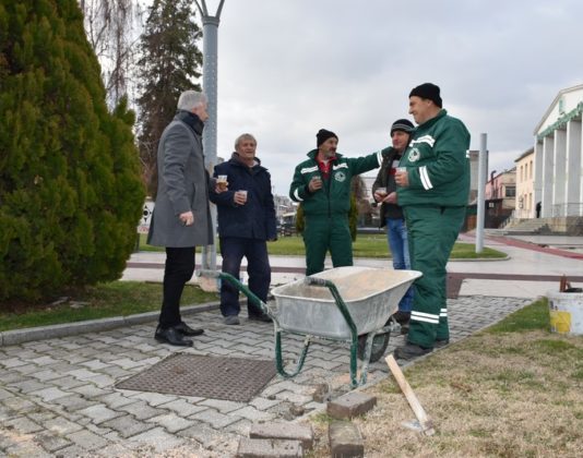 Затоа сите го почитуваат: Јовчески работниот ден го започна со кафе со комуналците кои го поправаат плоштадот “Александрија” (Фото)
