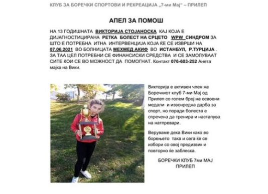 13-годишната шампионка од Прилеп има потреба од сите вас! Потребна е итна опepaциja за Викторија Стојаноска