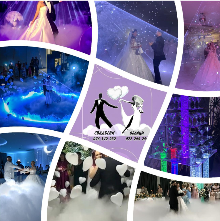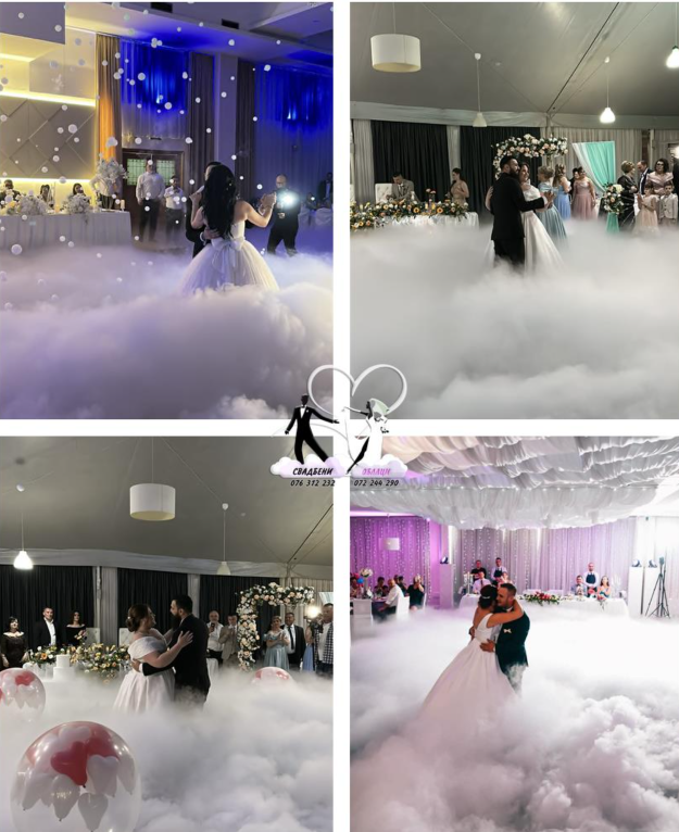 Со „Свадбени Облаци“, секој детаљ од вашата прослава станува магичен. Замислете го вашиот прв танц обвиен во волшебни облаци, кои додаваат доза на романтика и елеганција. Но, нашата понуда не застанува тука – ние ви нудиме и балончиња, меурчиња, ласер светло, светлетчка фонтна и други специјални ефекти кои ќе ја исполнат атмосферата со радост и изненадување, оставајќи силен и незаборавен впечаток кај вас и вашите гости.