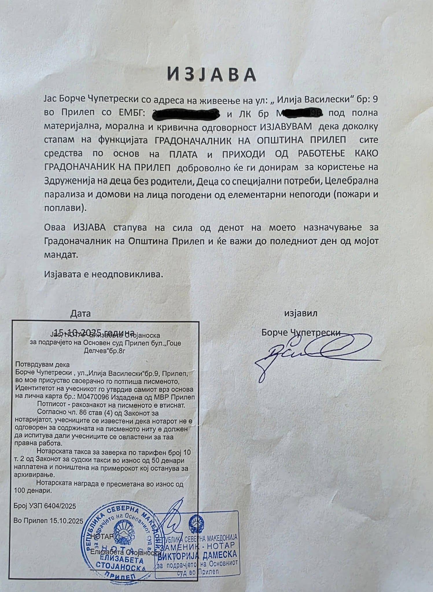 Независниот кандидат за градоначалник на општина Прилеп, Борче Чупетрески, денеска јавно објави писмена изјава заверена кај нотар, со која официјално се откажува од платата и сите надоместоци што законски му следуваат доколку ја извршува функцијата градоначалник.