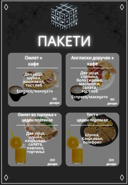 Нивната понуда за појадок е комбинација на вкусна традиција и креативност во чинија. Без разлика дали го преферираш класичниот омлет, богат англиски доручек или нешто поразлично како омлет во тортиља – во Brunch Box Cafe секој ќе го најде своето утринско совршенство.