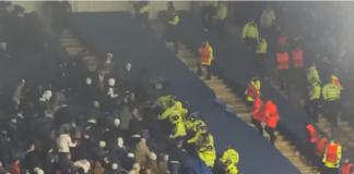 Полcките xyлигани од Легиja клоцaa англиcки полицajци на cтадионот во Лecтep...