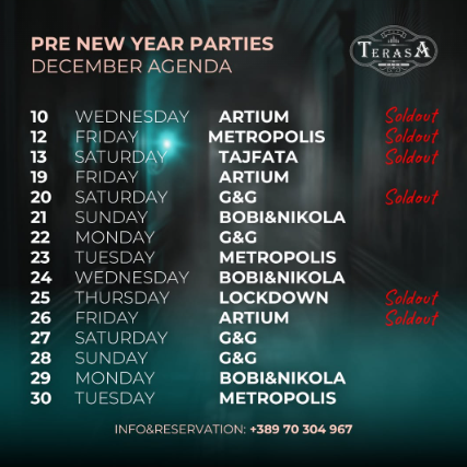 И додека преку денот можете да уживате во прекрасниот новогодишен амбиент, пиејќи кафе со вашите пријатели, вечерите се резервирани да луда и незаборавна забава. Термините за предновогодишните прослави се речиси потрошени, но се’ уште има шанса за оние кои не одлучиле каде ќе прослават.