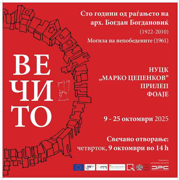 Шеснаесето гостување на изложбата „ВЕЧИТО – Богдан Богдановиќ“ во НУЦК „Марко Цепенков“ во Прилеп (Македонија), во соработка со НУ Завод и Музеј Прилеп. Изложбата ќе биде отворена на 9.10.2025 / четврток/ во 14.00 часот во фоајето од ЦК „Марко Цепенков“.
