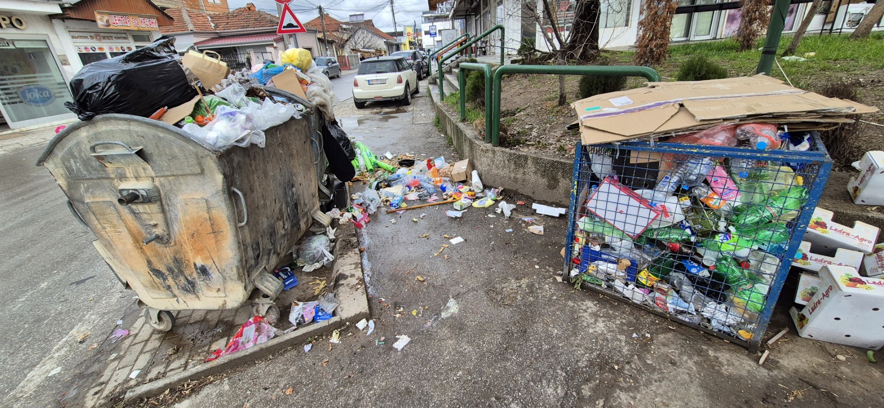 Слика која не ѝ доликува на урбана средина. Контејнери преполни со отпад, ѓубре расфрлано на сите страни, непријатна миризба и потенцијална опасност по здравјето на граѓаните – и тоа во непосредна близина на училиште, станбени објекти и продавници за храна.