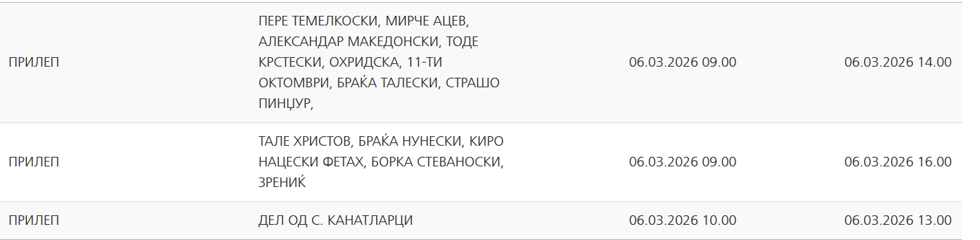 Повеќе улици во Прилеп и дел од населеното место Канатларци, во петок (06.03.) повеќе часа во текот на денот ќе бидат без електрична енергија.
