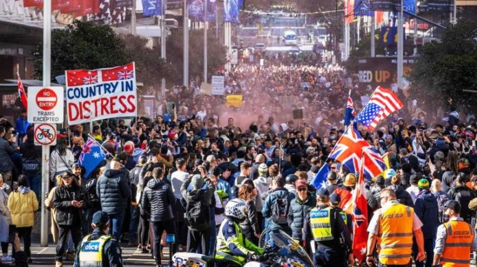 Во срцето на Сиднеј владее хаос, бидејќи демонстрантите против локдаунот, шетаат без маски, а излегоа на улиците во знак на протест против ограничувањата на КОВИД-19, предизвикувајќи судири со полицијата и 57 апсења.