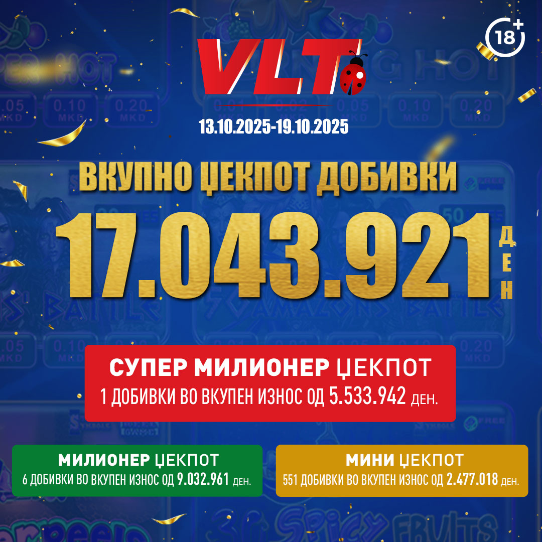 Во периодот од 13.10.2025 до 19.10.2025 Видеолотарија Касинос Австрија исплати фантастични 17.043.921денари кон играчите на ВЛТ терминалите ширум Македонија и тоа: