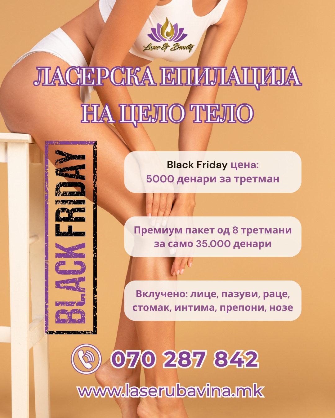 За малку ќе заборавевме, искористете ја BLACK FRIDAY промоцијата за ЛАСЕРСКА ЕПИЛАЦИЈА НА ЦЕЛОТО ТЕЛО, понуда на која нема да одолеете: