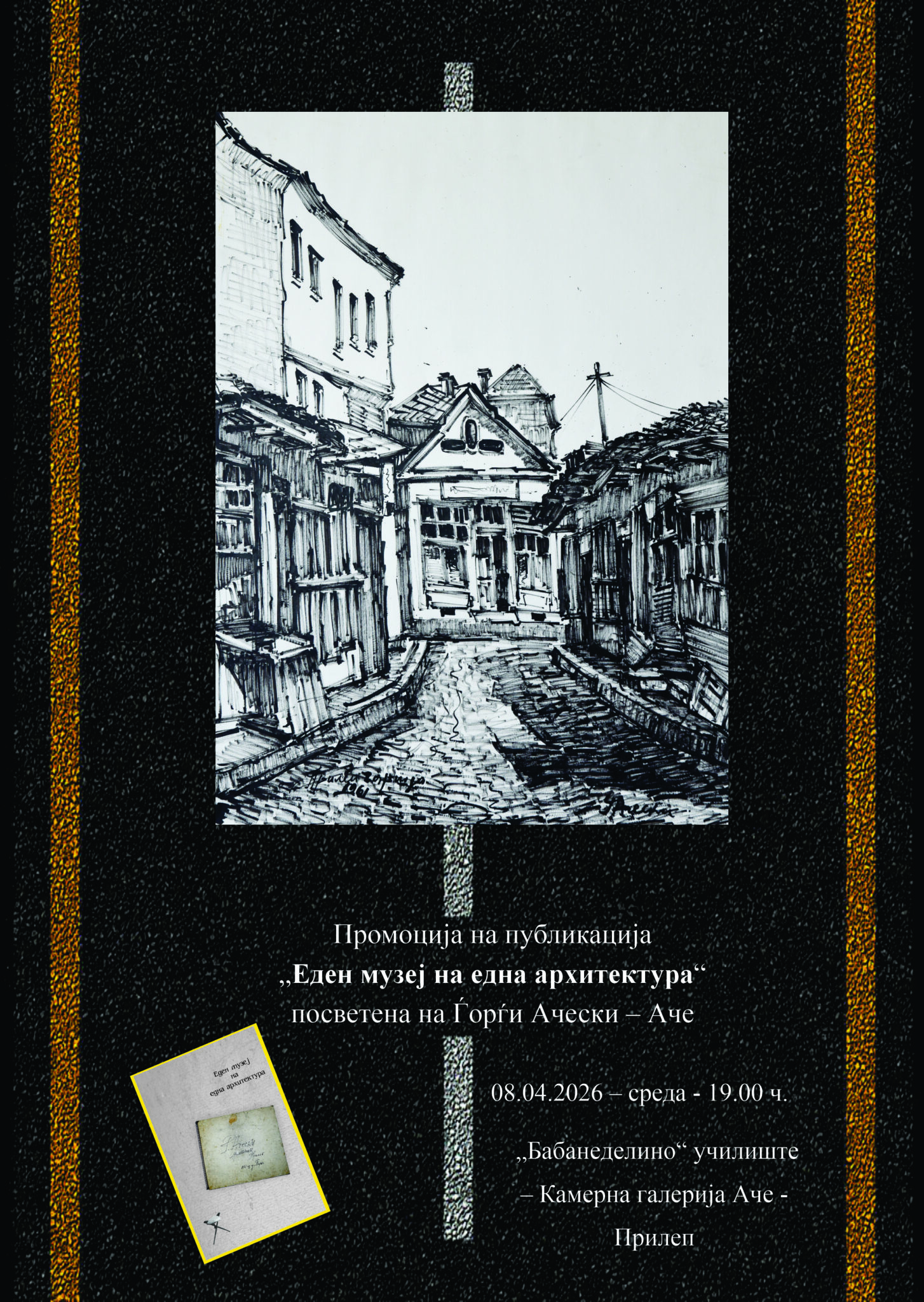 Вечерта ќе биде посветена на зачувувањето на колективната меморија неколку настани. Ќе биде промовирана монографијата „Еден музеј на една архитектура“ – дело кое низ цртежи, записи и сеќавања ја документира „сиромашно убавата“ македонска архитектура. ️ Воедно, ќе биде отворен нов културен простор во Прилеп – Камерна галерија „Аче“ – . Вечерта присутните ќе проследат дигитална презентација – Аче последниот боем со цртежи во сопственост на МАНУ, Националната галерија и приватни колекции.